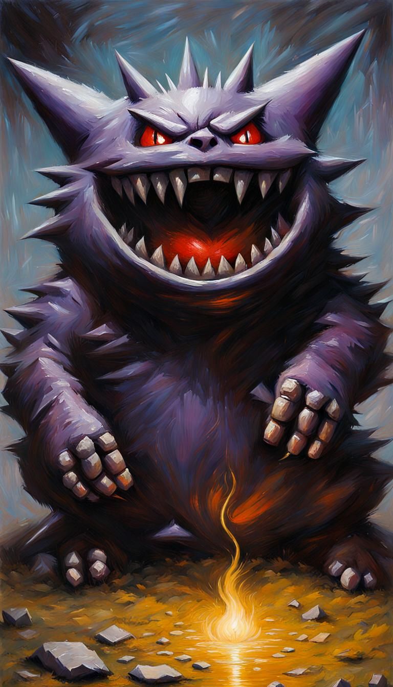A dramatic oil painting of Gengar with a sinister aura. The artwork features detailed brushwork and a dark, moody atmosphere.