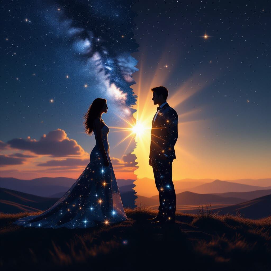 This image shows two figures composed of contrasting celestial elements against a divided landscape. The artwork features detailed textures and romantic silhouettes in a surreal, digitally-painted style.