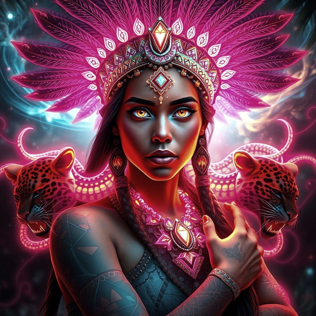 This stunning portrait captures the essence of a Guaraní shamaness, surrounded by neon jaguars, fractal snakes, and swirling cosmic energies in a vibrant jungle clearing. Intricately detailed and adorned with glowing geometric tattoos and a shimmering headdress, she embodies the fusion of traditional and...