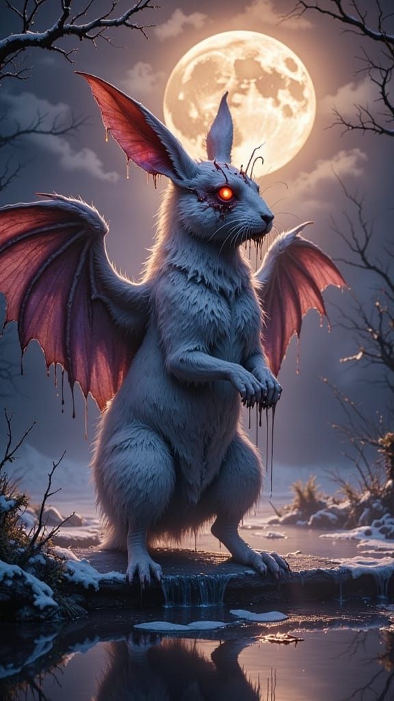 This image shows a hyperrealistic stoat standing upright in a dark, fantastical winter landscape. Blood drips from its mouth, and it has red bug eyes and glass wings in a dark fantasy style.