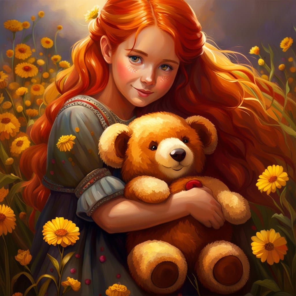 This image shows a red-haired girl embracing her teddy bear amidst a vibrant flower field. The scene is bathed in golden light, rendered as a dynamic oil painting.