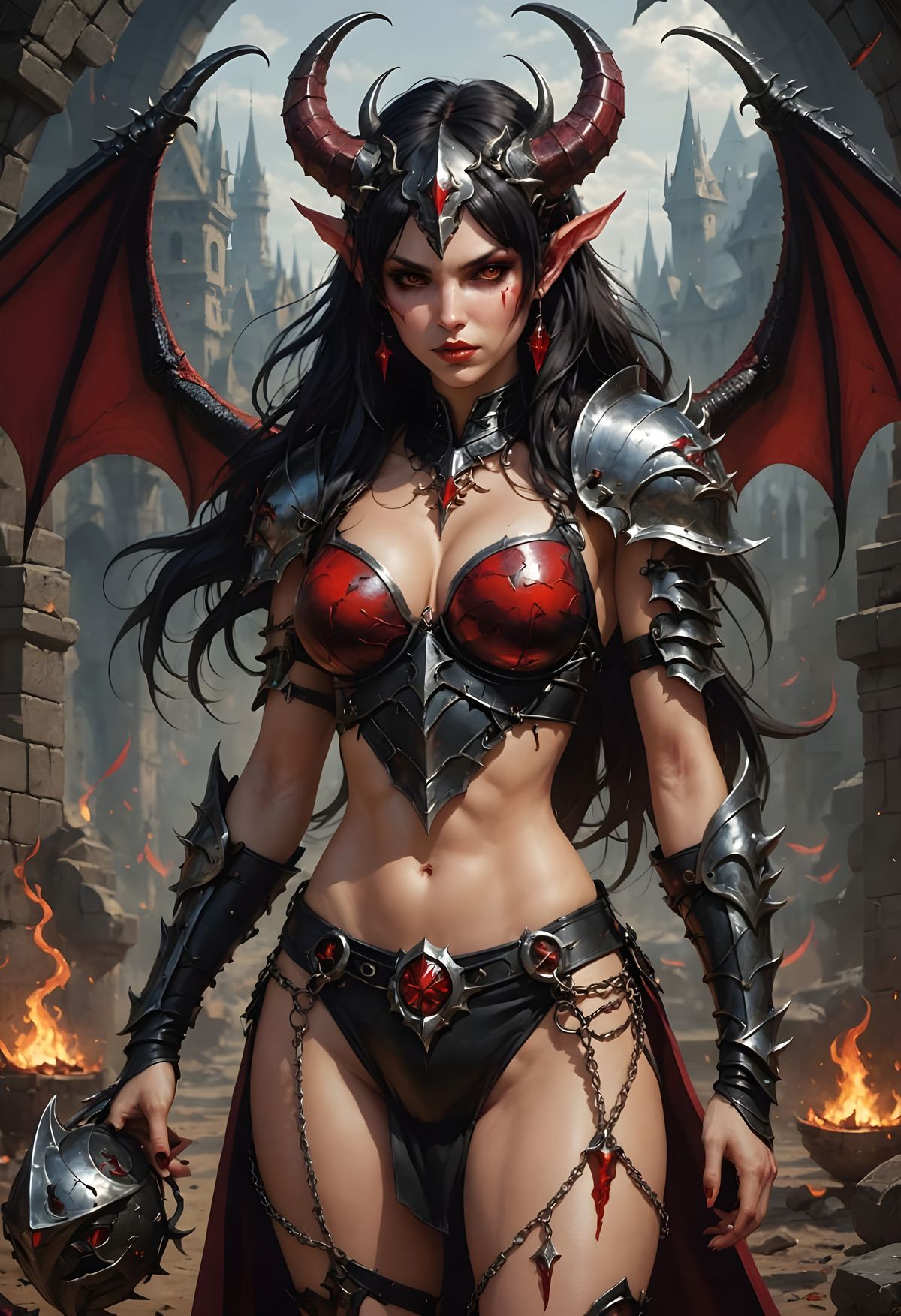 This image features a succubus with dragon horns in a ritualistic setting. The fantasy character is adorned in chain bikini armor within a blood circle.