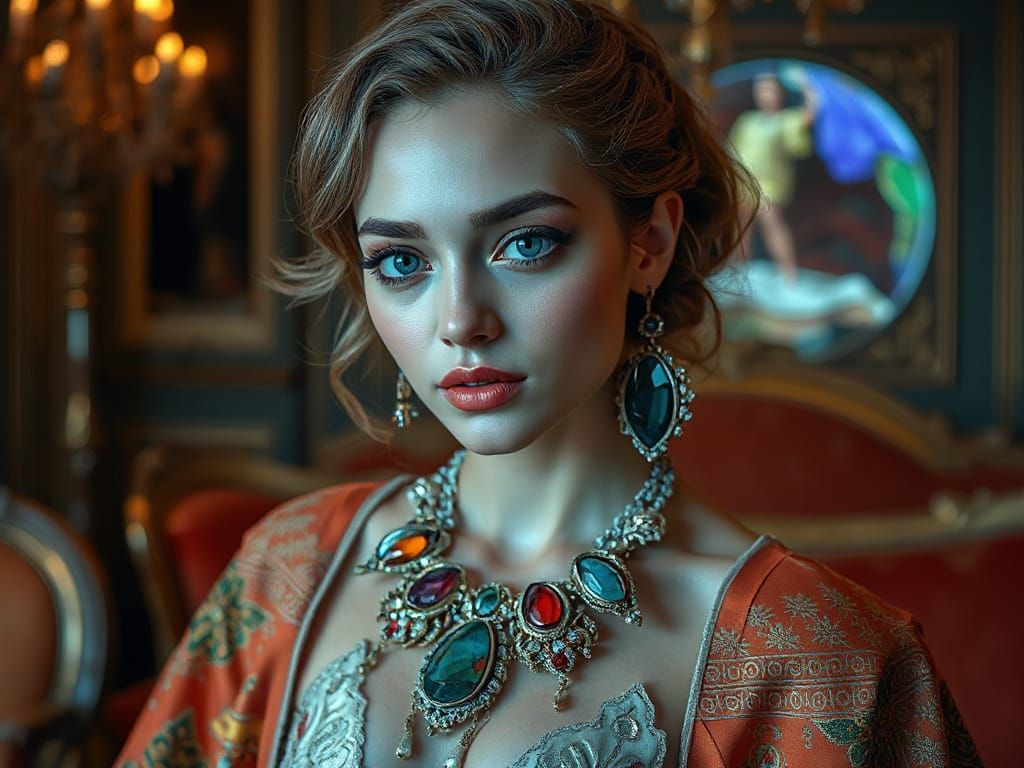 A striking picture of a woman in elaborate, colorful clothing and futuristic jewelry. The image features dramatic lighting, volumetric textures and a shallow depth of field as digital art.