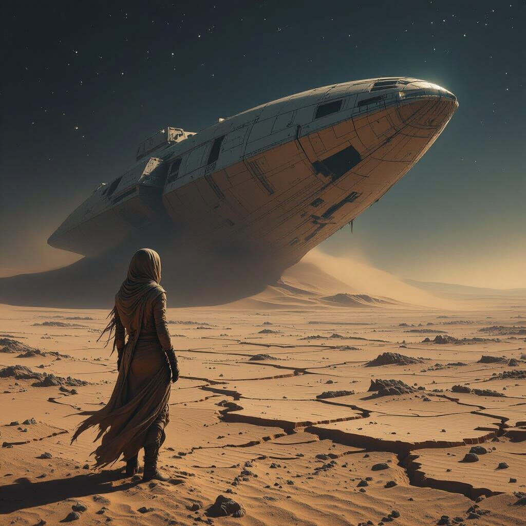 A lone woman in desert gear observes a massive, sand-buried spaceship on a cracked earth. The hyperrealistic image features dramatic lighting, emphasizing abandonment and vast emptiness.