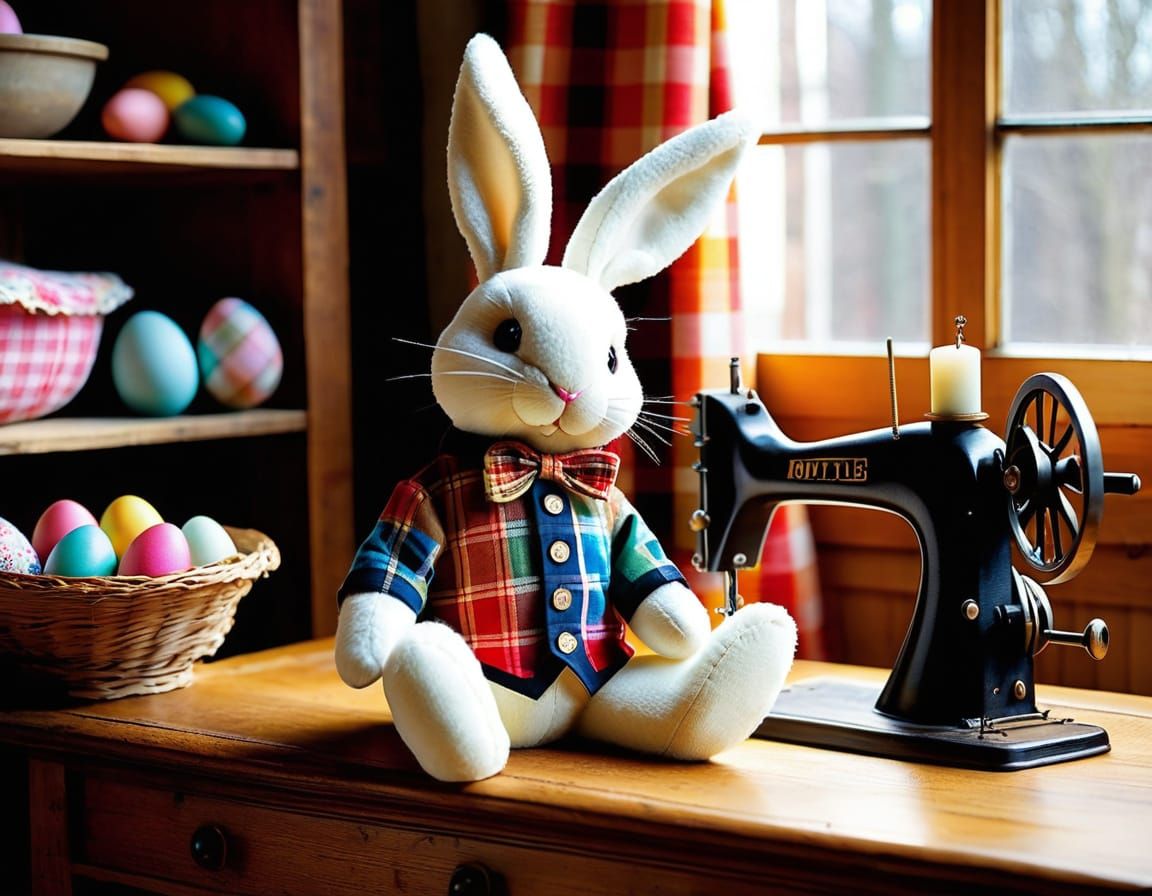 This charming image showcases a handmade Easter Bunny sculpture crafted from tri-color multi-gingham plaid fabric and plush toys, set amidst a rustic artist's loft with warm lighting and natural textures.