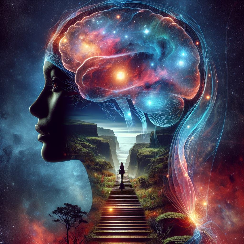 This image shows a double exposure artwork featuring a woman's silhouette with a landscape inside her mind. It blends portrait photography and graffiti elements with vibrant colors and realistic lighting.