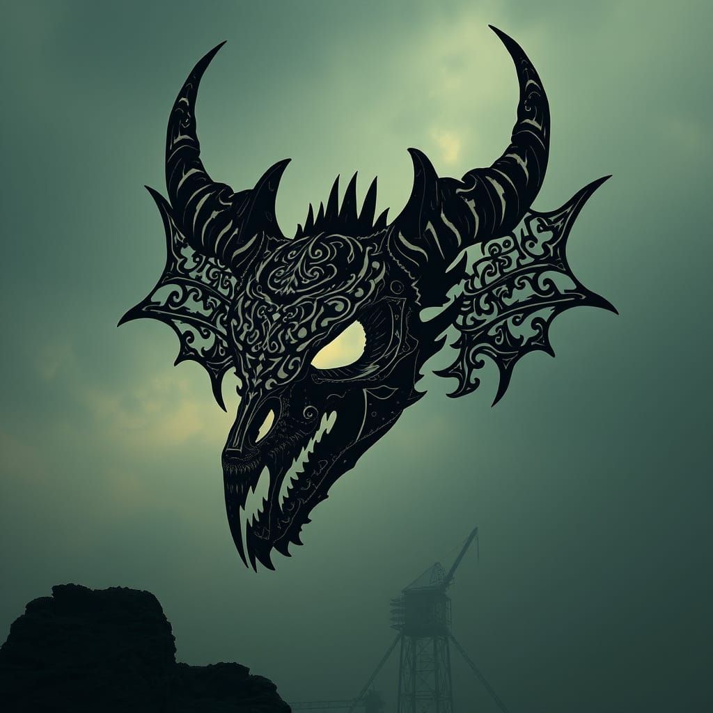 A striking picture of a horned dragon skull silhouette. Dovahzul runic motifs adorn the skull, set against a dark, mystical backdrop in a monolithic portrait, with a dark, mystical, and ancient atmosphere.