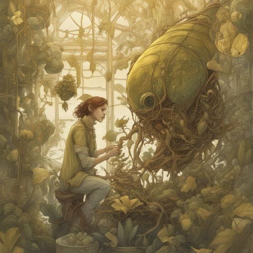 A digital painting of a Hufflepuff wizard tending to a giant Venus flytrap, featuring gold outlines and intricate organic tracery with a shiny aura. The image has a smooth, sharp focus.