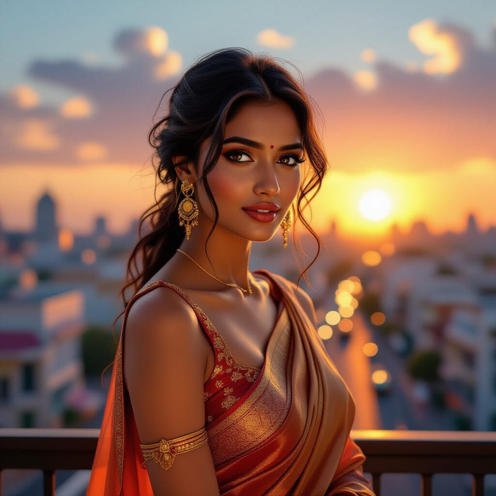 This digital art piece features a young South Indian woman in a stylish fusion outfit on a balcony at sunset. Golden light enhances her features, set against a city backdrop.