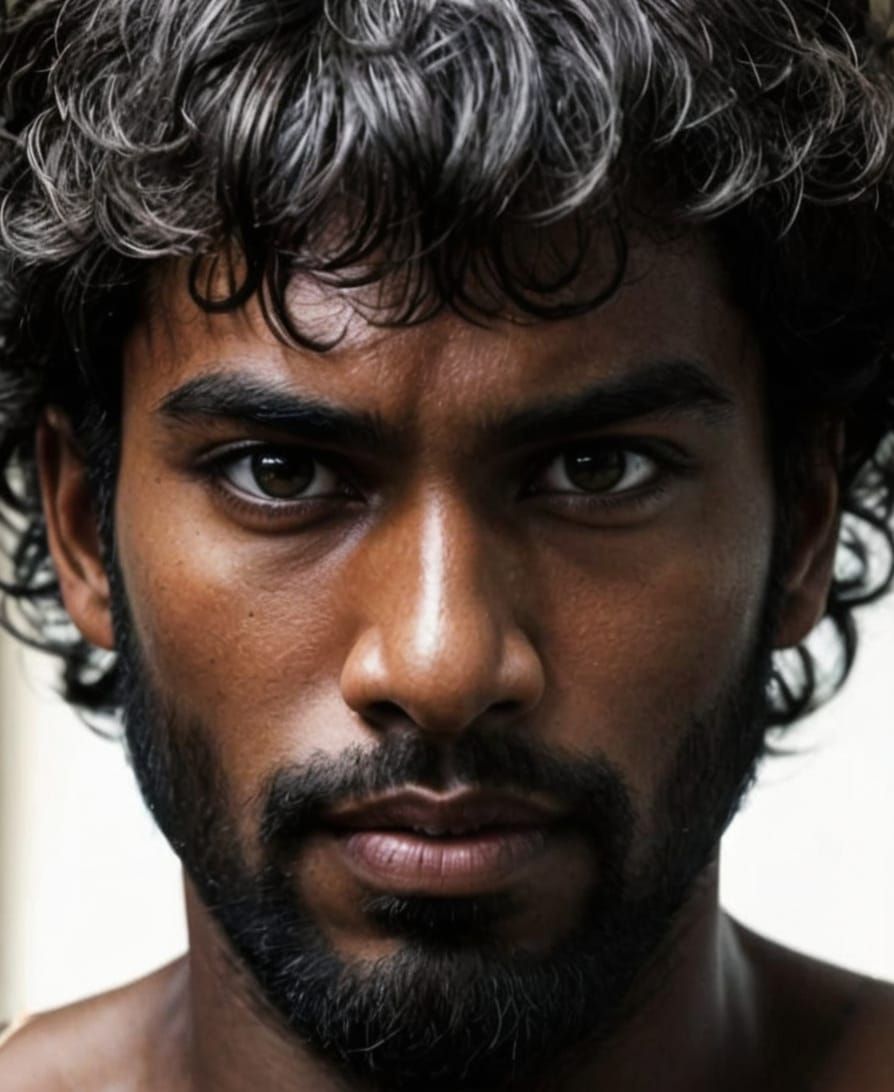 This hyper-realistic image shows a serious, dark-skinned Sri Lankan man posing shirtless after a workout, displaying his sweaty physique and muscular build.