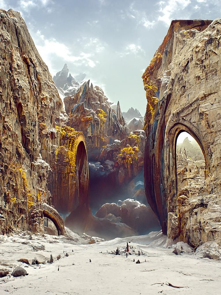 A striking picture of a stonepunk-themed magic portal connecting an icy world with a cyberpunk city. The landscape is highly detailed with global illumination, in a digital matte painting style.