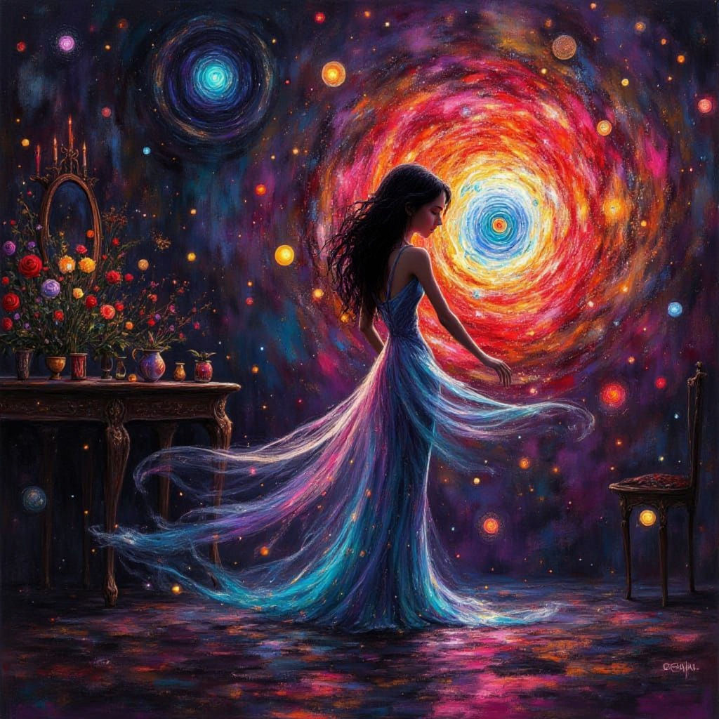 This image shows a woman dancing in a dimly lit room while a band plays. The image employs splash art techniques and a colorful background to create a dramatic effect.