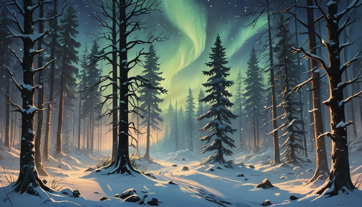 A captivating image of a twilight scene set in the mystical world of Nordthra. Ancient forests are illuminated by fireflies and the soft glow of the northern lights in this wintery scene.