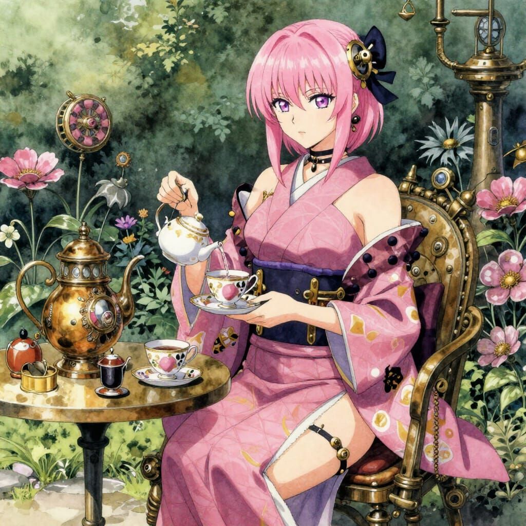 This image shows a pink-haired woman in a steampunk kimono serving tea in a metallic garden. Features a watercolor anime style with cel-shaded details and deep colors.