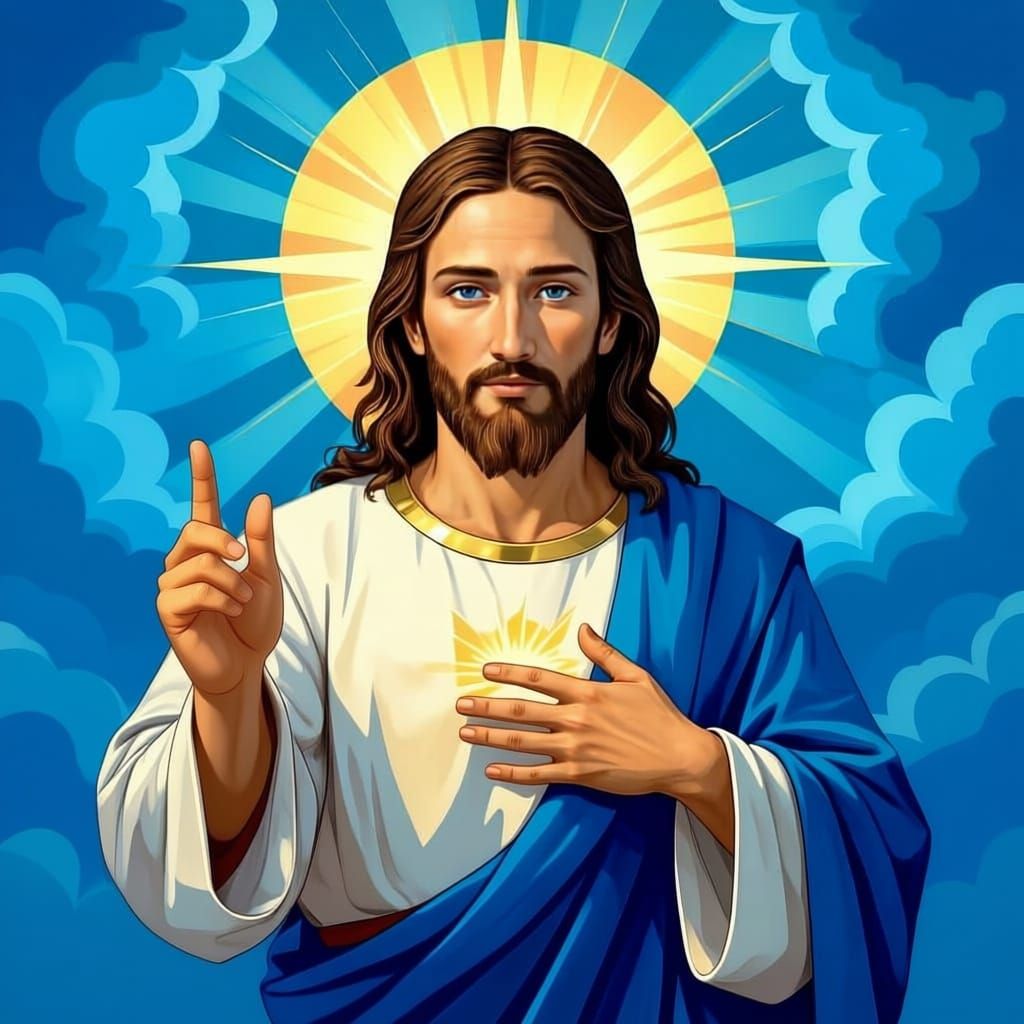 This image depicts Christ centered, with his right hand on his chest and left hand extended in a welcoming gesture. The background features shades of blue and white in a detailed, vibrant cartoon style.