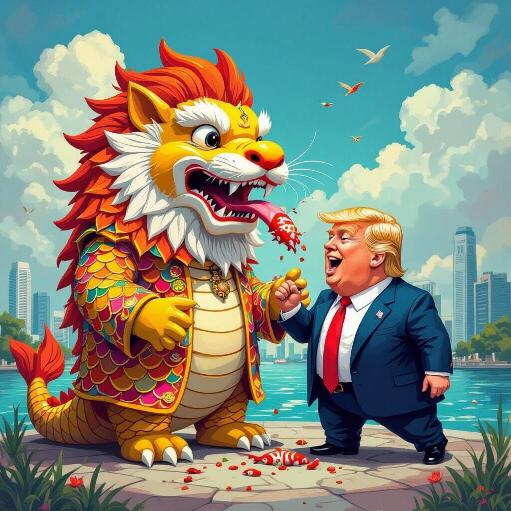A vibrant image of the Singapore Merlion in a fish-scale coat eating a cartoon Donald Trump. The whimsical scene is inspired by fantasy art styles with dynamic brushstrokes.