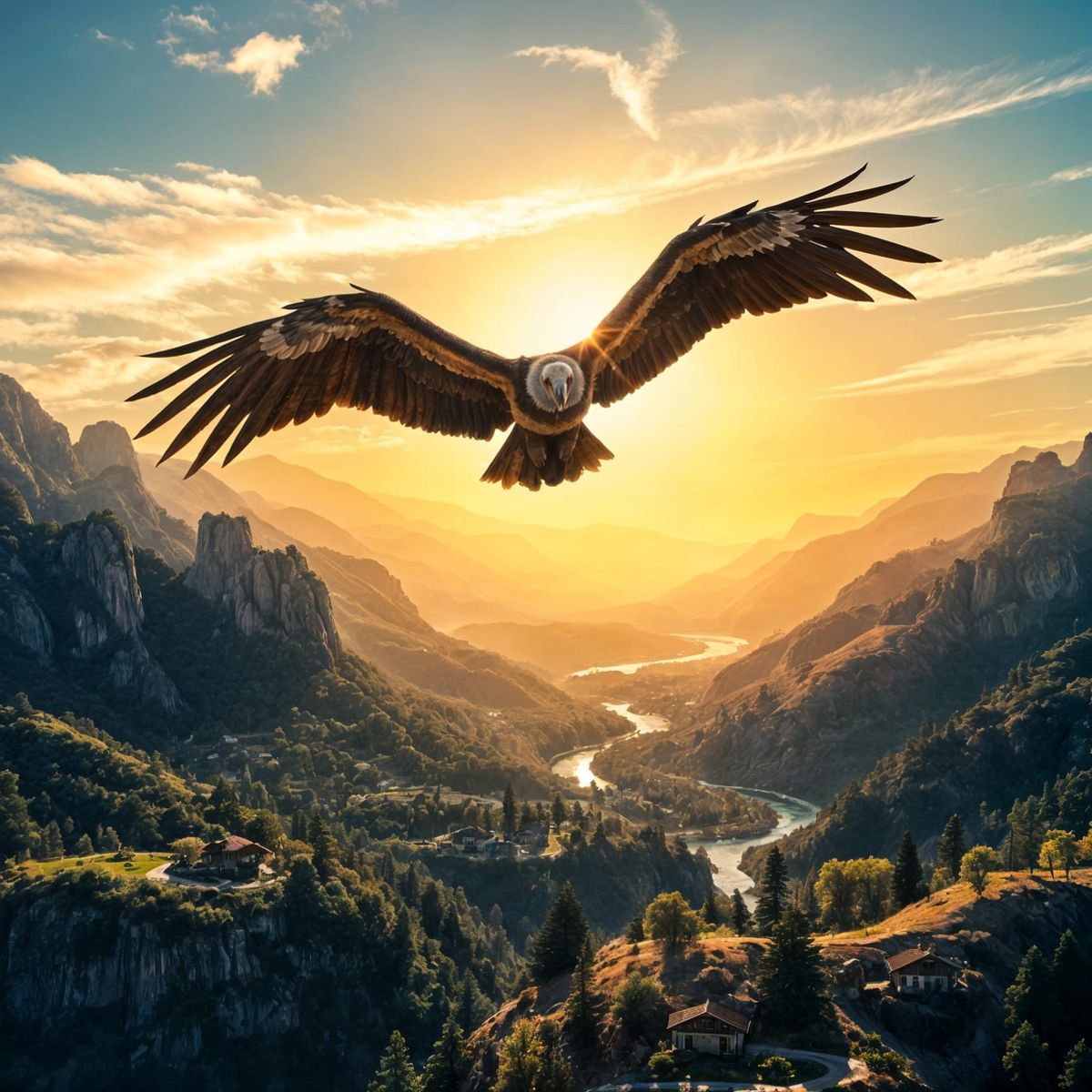 This image captures the serene beauty of a California condor soaring above a rugged, sun-drenched landscape, with emerald forests, granite mountains, and silver rivers, all bathed in the warm, golden glow of a setting sun, rendered in a photorealistic style with meticulous attention to detail and texture...