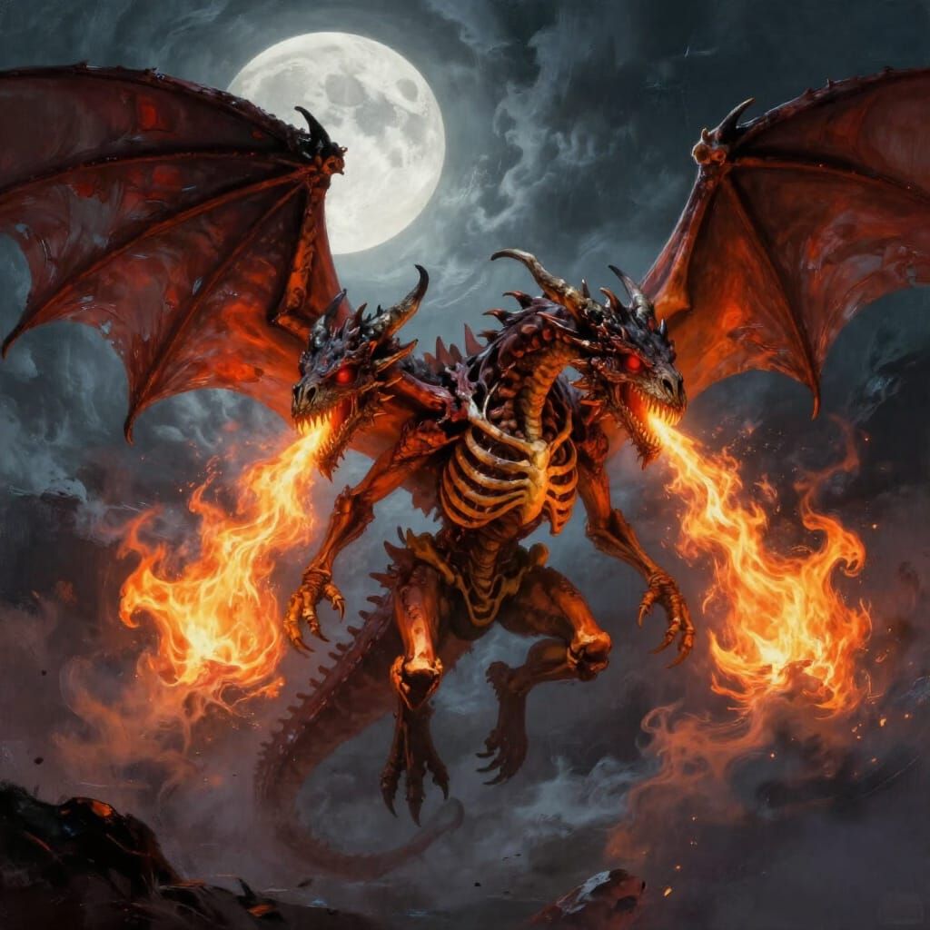 A fearsome two-headed skeleton dragon with glowing eyes and tattered wings exhales spectral fire while flying through a dramatic, moonlit storm. Digital art with dark fantasy vibes.