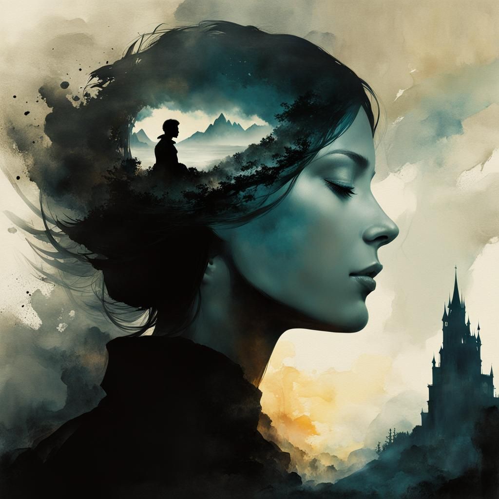 This image shows a double exposure effect blending a sleeping human face silhouette with an epic fantasy battle scene, rendered as a rough watercolor dreamscape. The artwork features simple forms and a romantic composition.