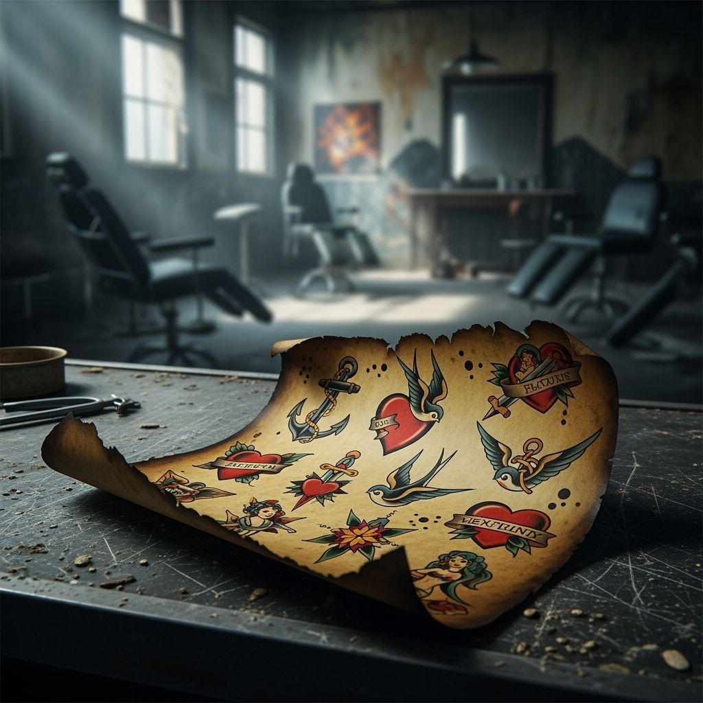 This image shows vintage tattoo flash designs on aged paper in an abandoned shop. The muted color palette and shallow depth of field enhance the scene's nostalgic feel.