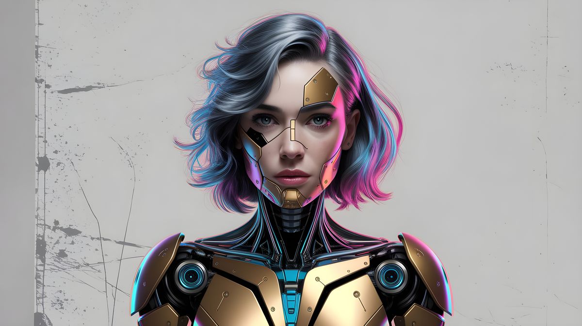 highly detailed, realistic, full frame, cubist portrait of a disheveled cyborg woman with A.I. advanced electronics with only gold colours on textured white canvas, cubism, abstract, surreal, hyper dynamic lighting effects, .................