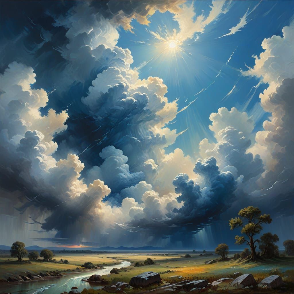 This impressionist masterpiece features thick, textured gouache brush strokes on canvas, blending vivid blues and ethereal whites to depict a vast, serene sky.