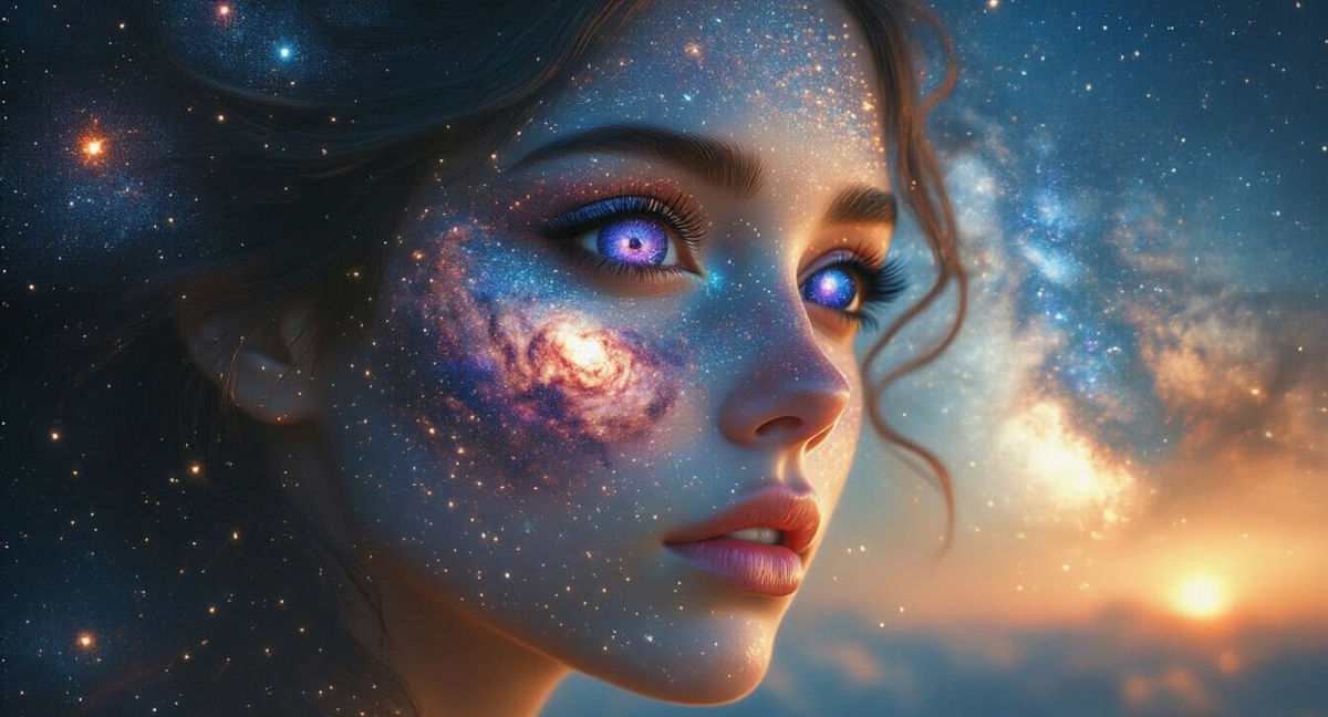A striking picture of a woman's face composed of cosmic elements. The artwork showcases a galaxy-themed face with eyes filled with stars in a realistic style.