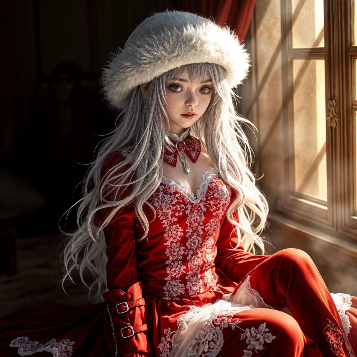 This image shows a mysterious young woman dressed in a stunning red gothic outfit with intricate white lace and elegant boots. Her flowing white hair is adorned with a white fur hat, evoking a sense of whimsy and romance.