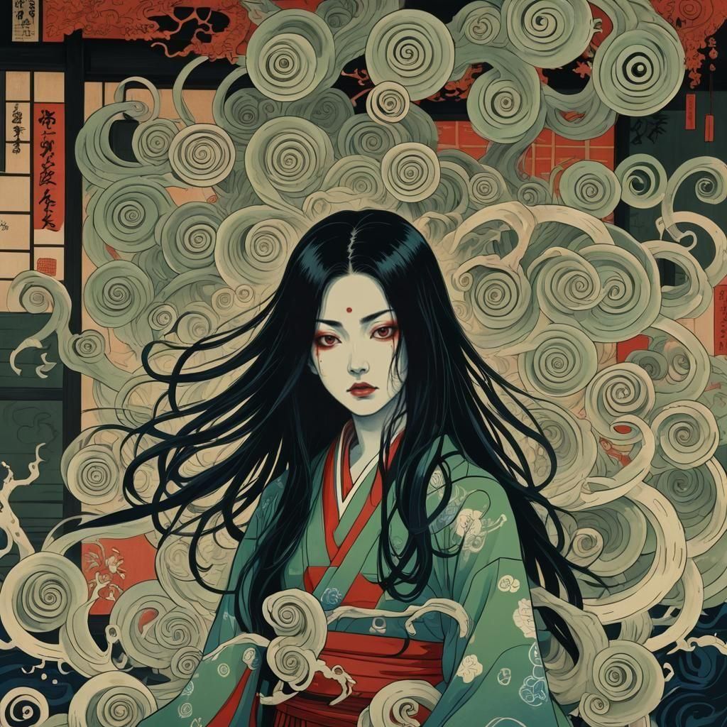 "Ukiyo-e, Junji ito inspired spiral horror art, traditional japanese, detailed, tomie, woman, long black hair, spirals, body horror abstract art complementary colors fine details"