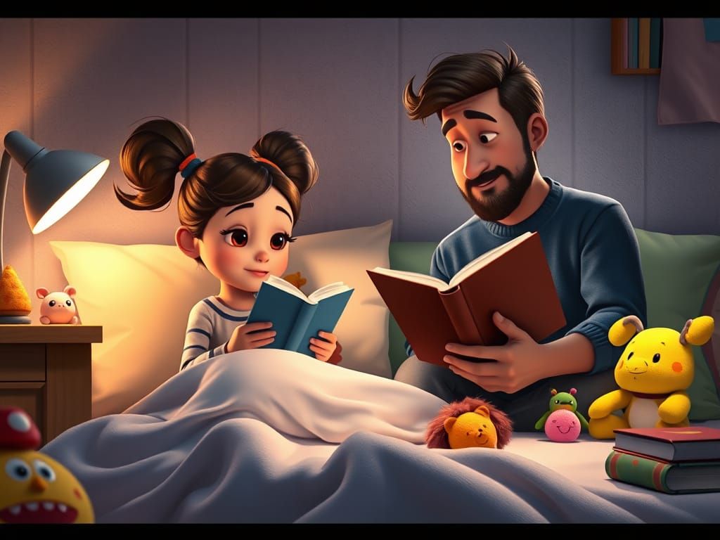 : A cozy scene of bedtime stories, with a female child with high ponytails,tucked in, dad sitting next to bed, mid-story, his face illuminated by the soft glow of a bedside lamp. The room is filled with plush toys and colorful books, creating a sense of warmth and security. The scene is rendered in a ...