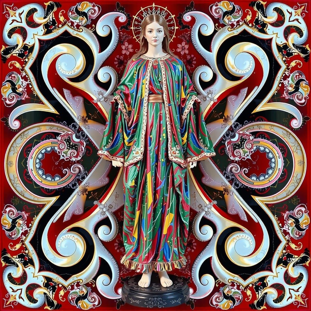 This image showcases a sculpture with vivid red, green, yellow, black, and white colors. It features intense, dynamic lighting and intricate textures in a hyperrealistic style.