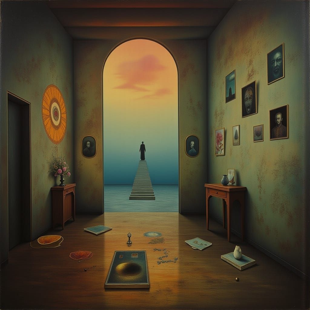 Feeling a few steps to the left of better days. Intensely surreal imagery and atmosphere, hypnagogia, liminal, clinical depression, psychosis, a mixture of 20th century Surrealist influences, Rembrandt lighting, rich textures, oil on canvas. <lora:STRANGE WORLD:1.0> <lora:TwilightZone:1.0> <lora:StairsNCases:1.0> ...