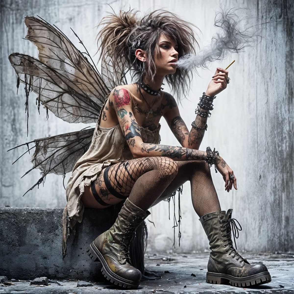 This image shows a punk-goth urban fairy casually posing against a derelict concrete wall. The full-body portrait features torn fishnet stockings, military boots, tattoos, piercings, and tattered wings.