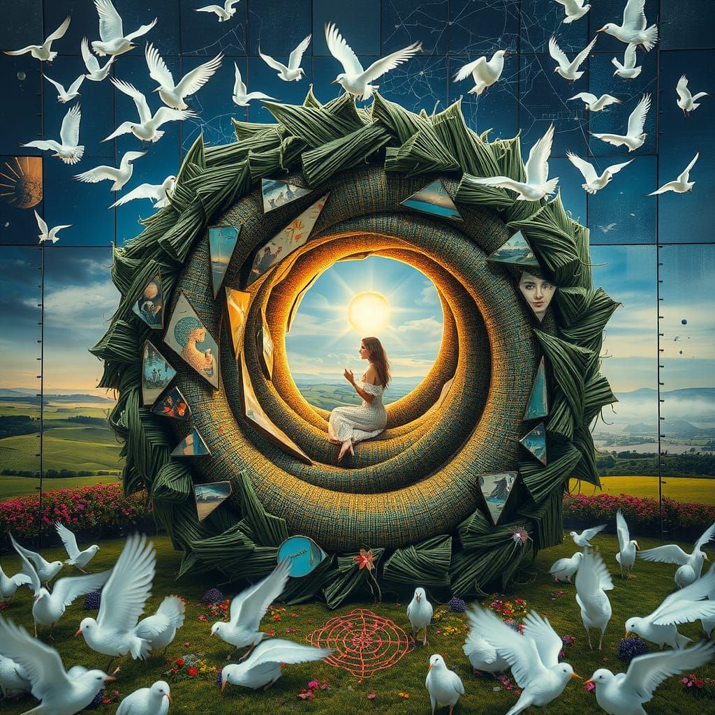 This image showcases a sculptor within a spiral sculpture, surrounded by glowing mythical beings and fragmented mirrors. It features abstract designs and mist in a serene landscape, rendered in a vibrant, textured style.