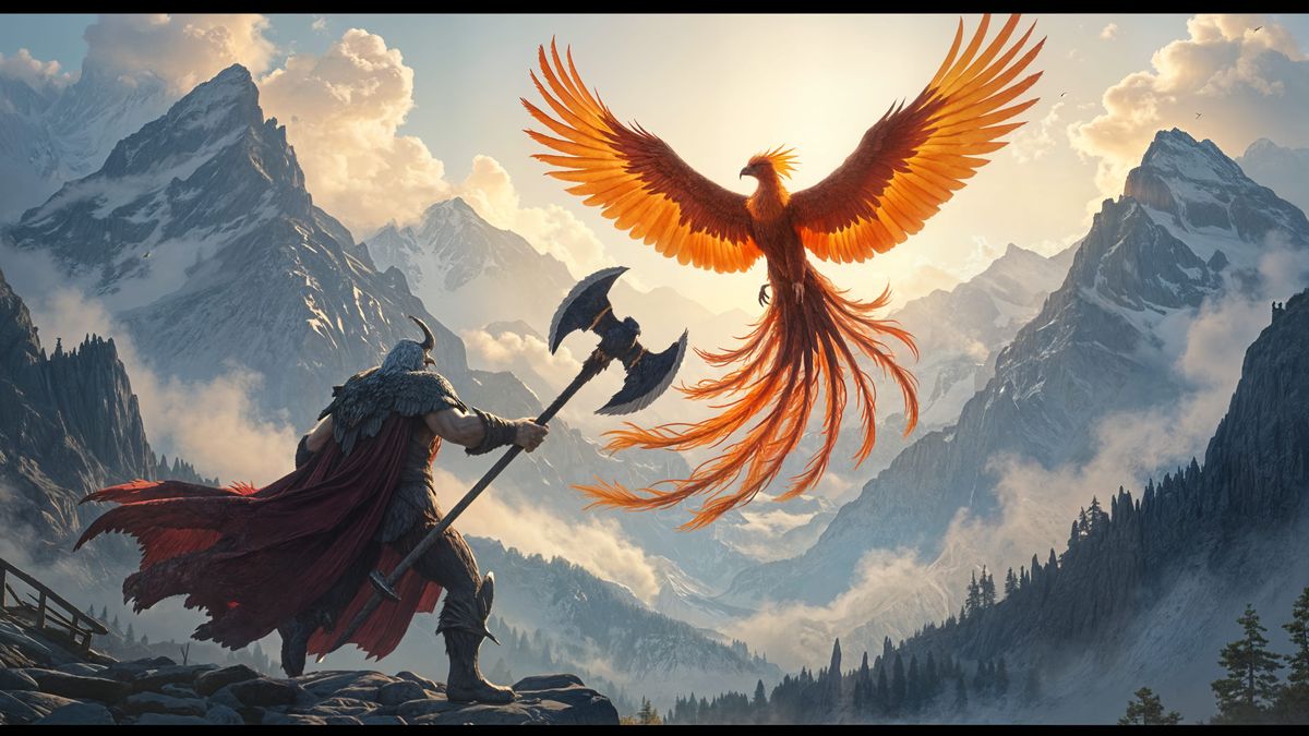 A cinematic artwork depicting a powerful Half-Giant hunting a majestic phoenix with molten gold and crimson plumage, set against misty mountains with an ethereal glow.