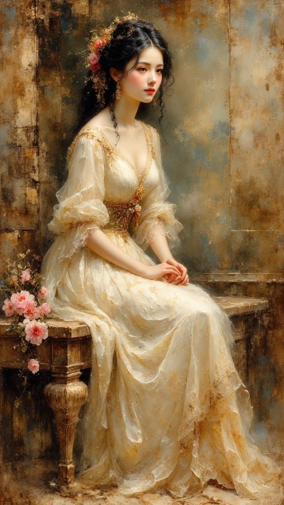 A portrait of a beautiful oriental woman from the 1800s. The image has an ethereal aesthetic and appears to be rendered in an ink wash painting style.