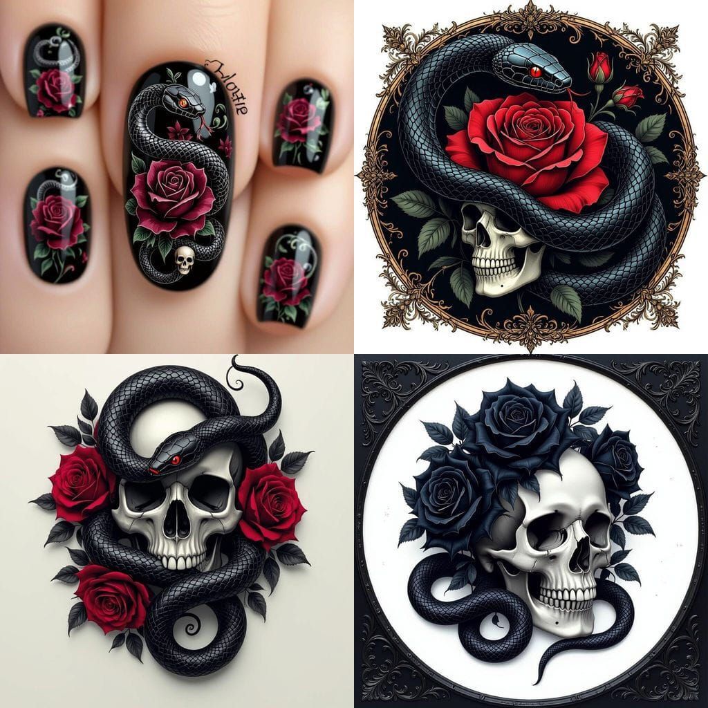 This AI-generated image showcases a captivating dark romance nails design featuring a black snake, delicate roses, and a skull motif.