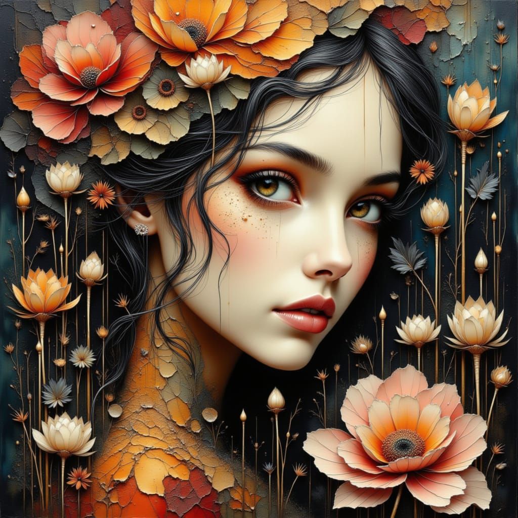 This image presents an elegant female portrait, blending floral elements with a dreamlike, surreal fantasy aesthetic. Rendered in watercolor with dynamic lighting and intricate details.