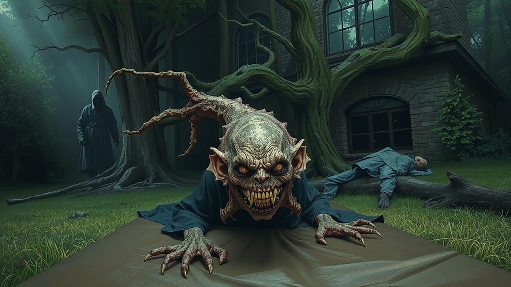 A horrifying, six-foot-tall sleep paralysis demon with glowing eyes and grotesque features stands in a darkened bedroom. The image evokes a dark, gothic aesthetic.