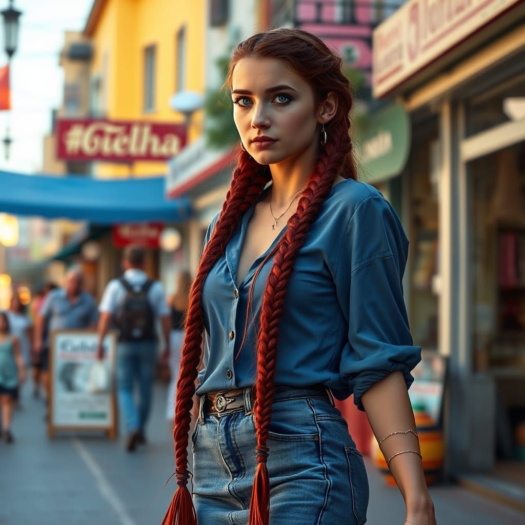 This image shows a red-haired woman walking through a busy shopping area. She is wearing a denim skirt and blue blouse, with side lighting highlighting her features, captured in a hyperrealistic style.