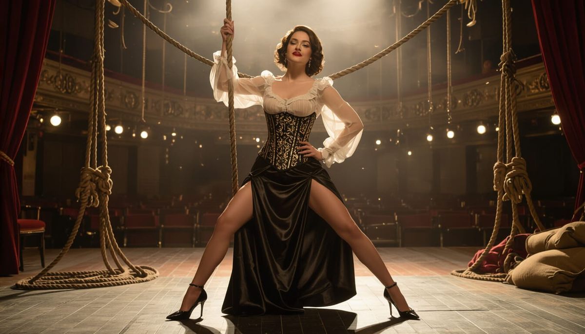 A captivating hyperrealistic portrait of a woman in a brocade corset and satin skirt, posed backstage at an opera house. The image captures exquisite textile detail in a dramatic, theatrical style.