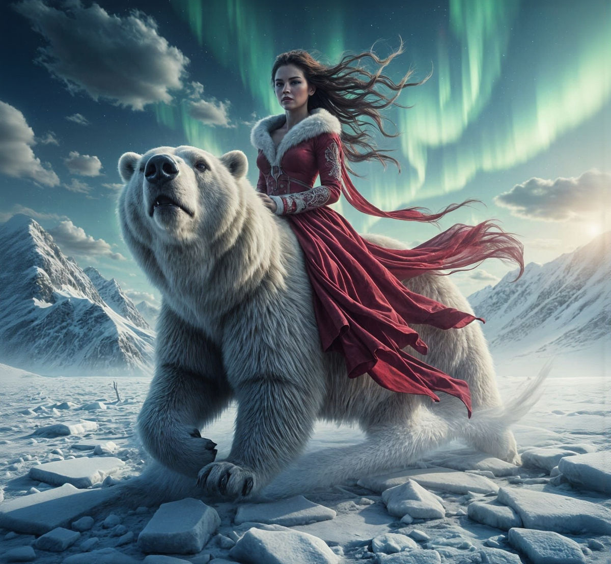 This hyperrealistic image depicts a beautiful warrior woman in a red velvet dress with white fur, riding a polar bear on the North Pole amidst a stunning aurora borealis.