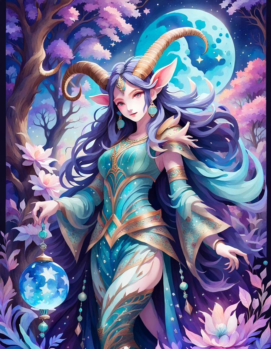 (fantasy watercolor anime of shimmering divine figure of a female satyr with hoof, big ram horns and glowing elaborate tribal painting all over the body wears loose clothing with detailed carved wooden ornaments,:1,7) magical fairytale, bioluminescent fantasy forest in iridescent colors on a moonlit ...