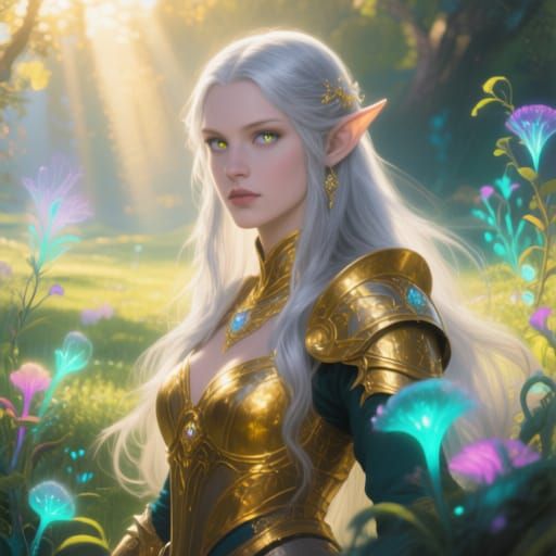 A striking picture of an elven woman in golden armor standing in a sunlit glade. The image features bioluminescent flora and dynamic lighting, with hyperdetailed textures in an ethereal fantasy style.