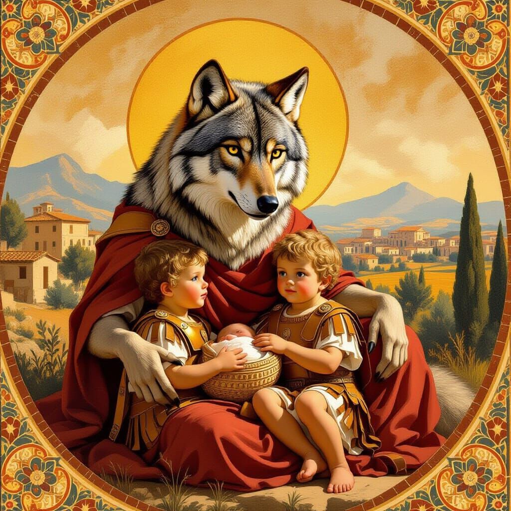 This image shows a she-wolf tenderly nursing twin boys dressed in Roman tunics. The scene is bathed in warm light, set against an Italian landscape, and rendered in the style of a Roman fresco with intricate mosaic details.