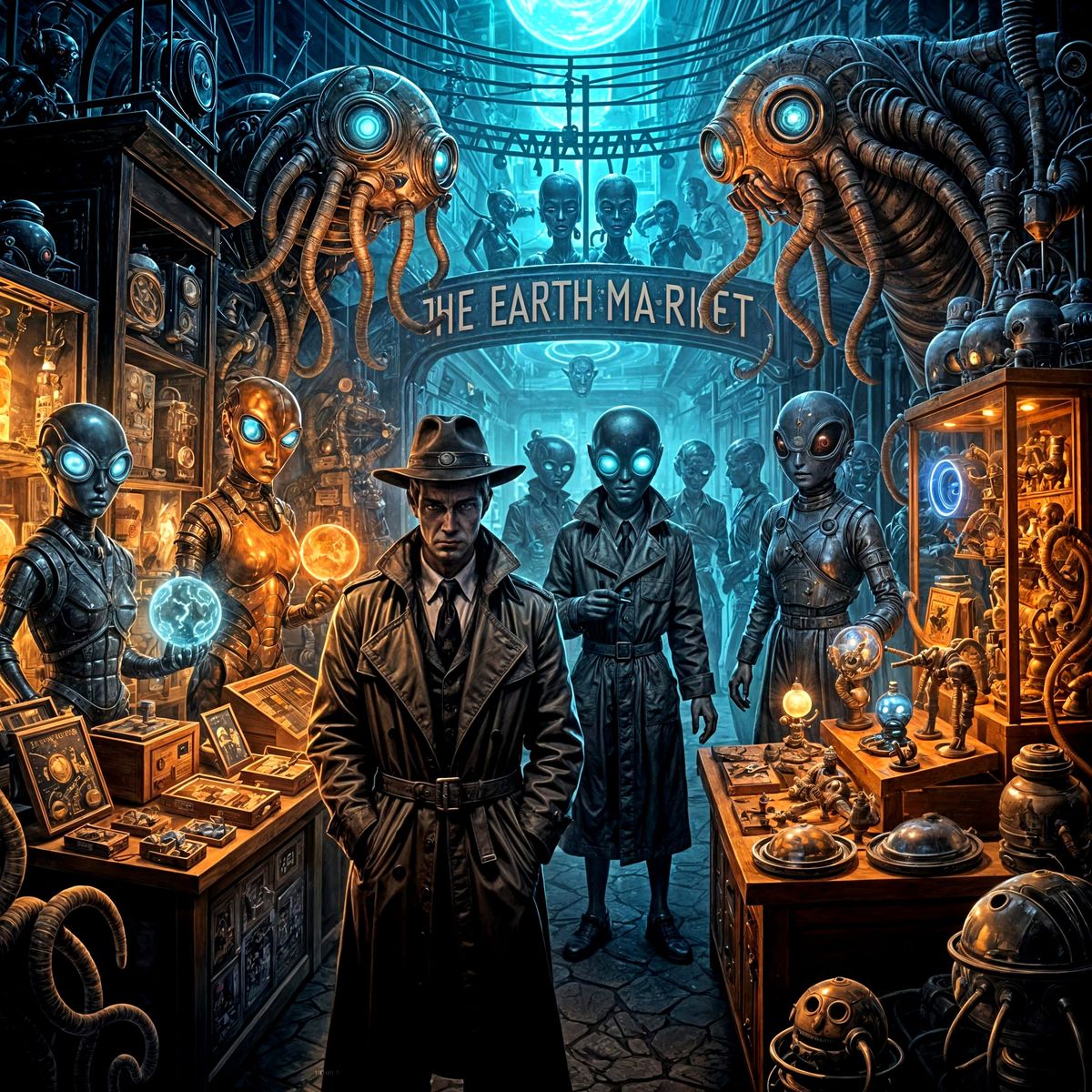 This image depicts a bustling alien marketplace reminiscent of 1950s pulp magazine art. Various extraterrestrial beings trade glowing gadgets, creating a vibrant, retro-futuristic scene.