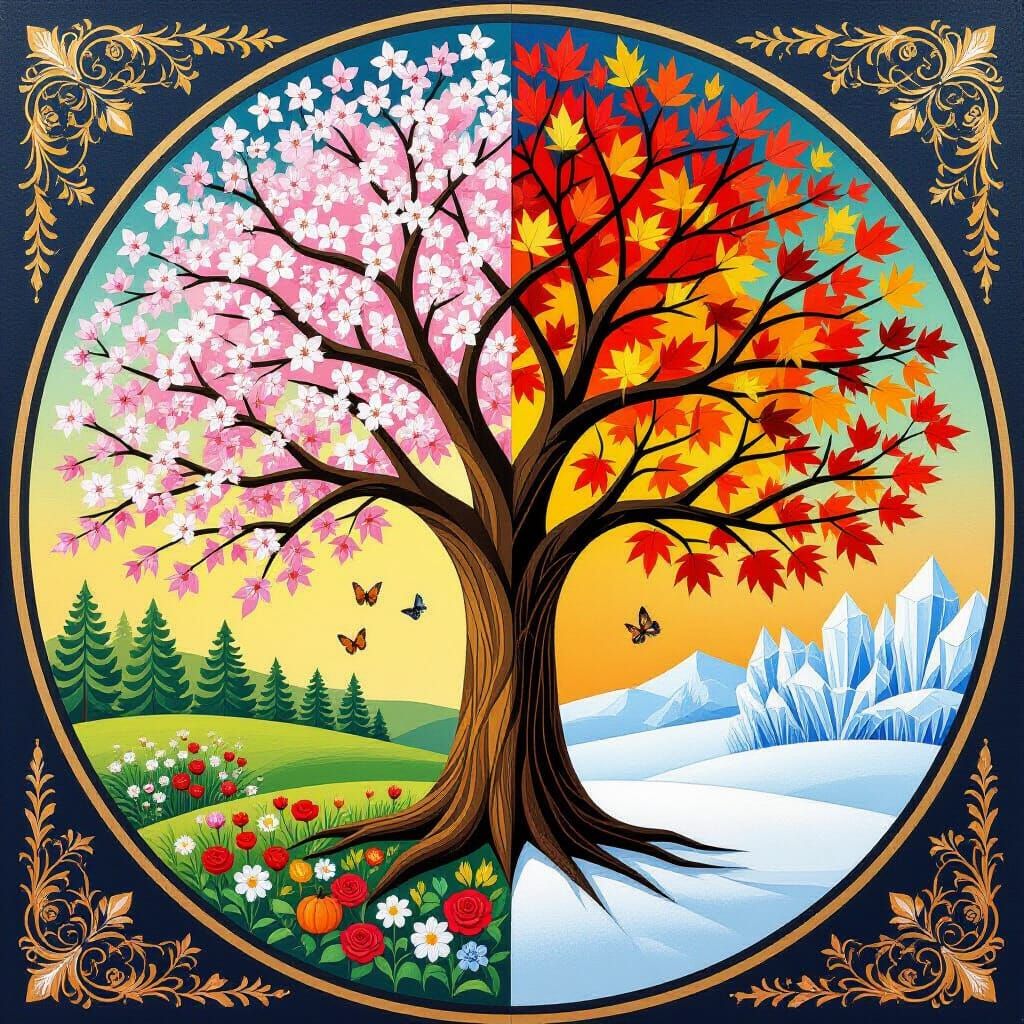A magnificent Art Deco-inspired painting showcases a spiraling tree with each section representing a season, rendered with geometric harmony and rich, metallic-accented colors.