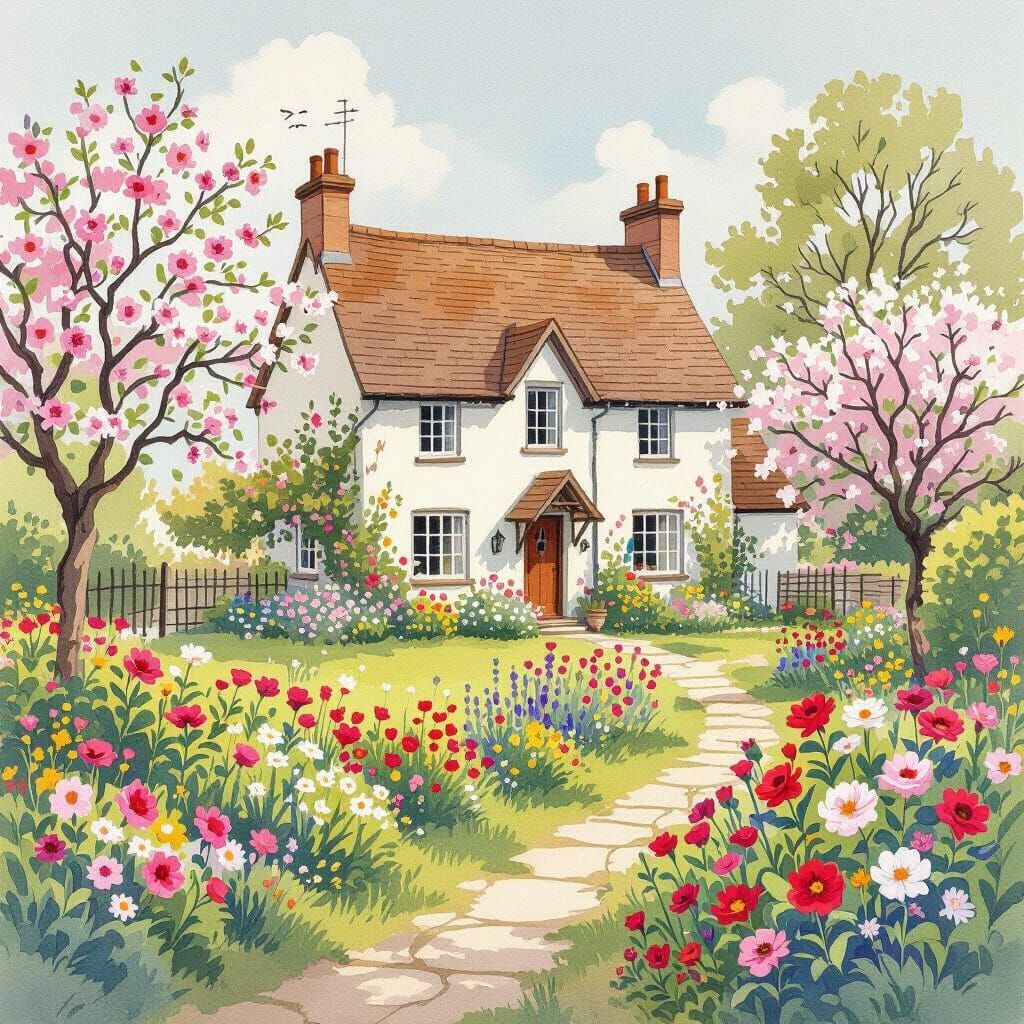 A serene farmhouse nestled in a colorful garden with flowers and trees. The image is rendered in delicate lines and watercolor textures, reminiscent of impressionist landscapes.