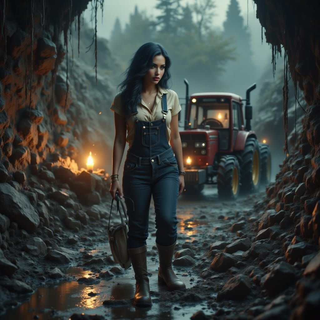 This image shows a cinematic scene of a woman and her tractor falling into a deep cave on a hillside. Rendered with film grain and dramatic lighting for an epic, atmospheric quality.