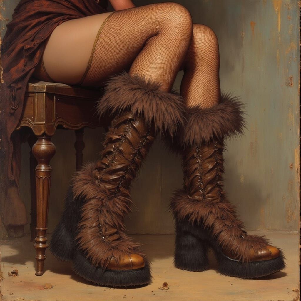 <lora:Concelo:1.0> <lora:Ludicra:0.45> <lora:96 Tears Flux:0.3> <lora:Lapsus:0.55> low angled, canted view of the legs of a seated woman in fishnet stockings and furry boots, fuzzy long shaggy muppet fur pelt exterior to the boots, platforms inspired by Nyuju Stumpy Brown,